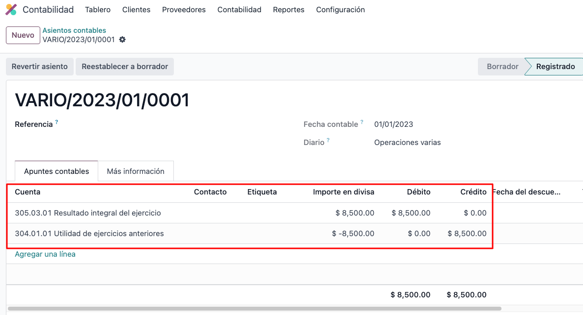 b) Create a journal entry where you "balance" (close) these accounts against the "9999 Unrealized Profit/Loss" account (which we rebranded to 305.03.01 Resultado integral del ejercicio) - this acocunt should be the "Cureent year earnings type". The date should be the day in which you set the fiscal year closure.