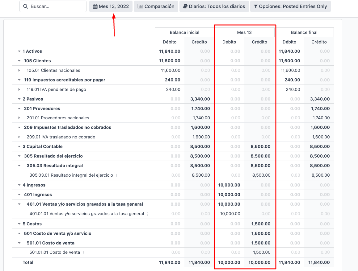 Once you set all of this, you can do the following process to close the fiscal year and have the Month 13 Trial Balance. This is shown in the following video (ES - Cierre fiscal con Mes 13):