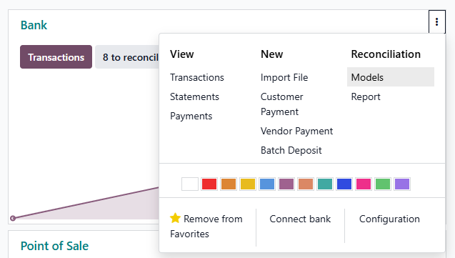 Secondly, you can add more of those gray reconciliation buttons you see when in bank matching mode (if you need to add more from the default) by going to the Reconciliation Model menu... Odoo documentation is not updated for latest v18.4e the last time I checked, and you can go to that via any bank/cash Dasbhoard card's "three-dot" menu, and select "Models" under Reconciliation: